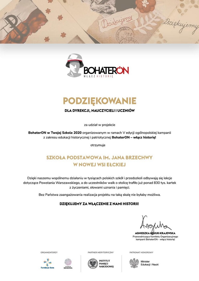 Uczniowie Szkoły Podstawowej im. Jana Brzechwy w Nowej Wsi Ełckiej wzięli udział w akcji „BohaterON – włącz historię!”. Kolejny raz szkoła zgłosiła swój udział w ogólnopolskim wydarzeniu, którego celem jest upamiętnienie i uhonorowanie uczestników Postania Warszawskiego poprzez wysłanie im specjalnie na tę okoliczność przygotowanych kartek, albumów, plakatów, rysunków.