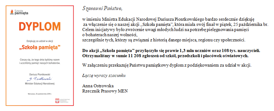 Za udział w akcji nasza szkoła otrzymała podziękowanie oraz dyplom od Ministra Edukacji Narodowej Dariusza Piontkowskiego.