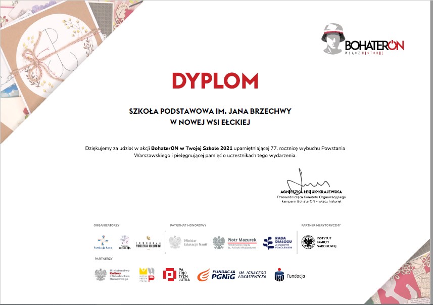 Po zakończonych działaniach trzymaliśmy podziękowanie oraz dyplom za udział w akcji "BohaterOn w Twojej Szkole 2021" będącej częścią ogólnopolskiej kampanii BohaterOn - włącz historię!