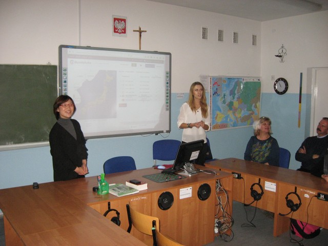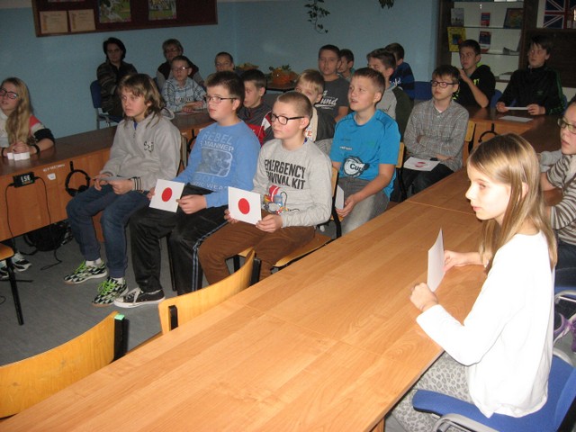Uczniowie powitali gościa japońskimi flagami.  Yang z wielkim zaangażowaniem opowiadała w języku angielskim o swoim kraju, szkolnictwie, klimacie. Do tego celu między innymi posługiwała się Internetem, by bardziej przybliżyć  Japonię, jej tradycje i zwyczaje. Odpowiadała także na pytania. Dzieci chętnie zadawały pytania w języku angielskim. Pani Yang pochwaliła dzieci za ich znajomość języka.  By uatrakcyjnić wizytę w naszej szkole, pani Wanda Kochanowska zaprosiła Japonkę  do naszej regionalnej „Chatki Babuni”. W skrócie opowiedziała o życiu, zwyczajach, wytworach  polskiej wsi.