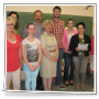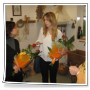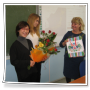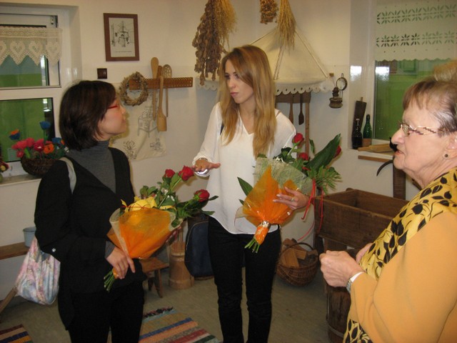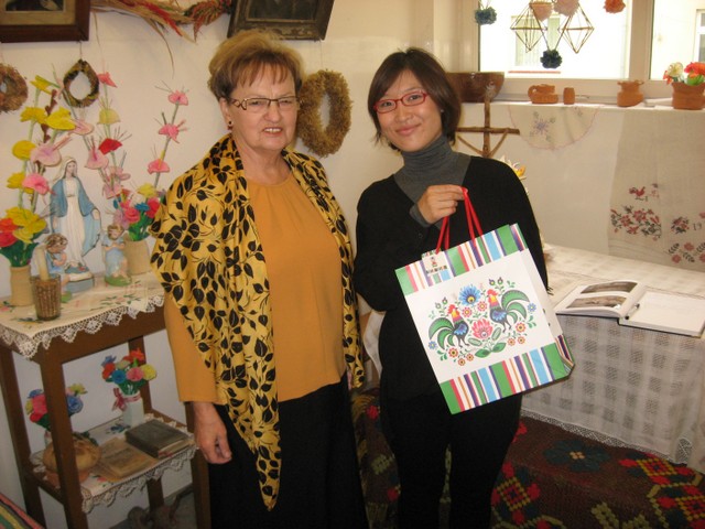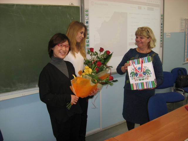 Na koniec spotkania przemiłej pani Yang, uczniowie wręczyli kwiaty i polskie słodycze, a pani Wanda wyszywaną ręcznie serwetkę.
