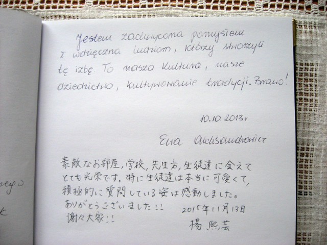 Na pamiątkę pobytu w naszej szkole Yun Xiyun Yang dokonała wpisu do Księgi pamiątkowej w języku chińskim i japońskim.
