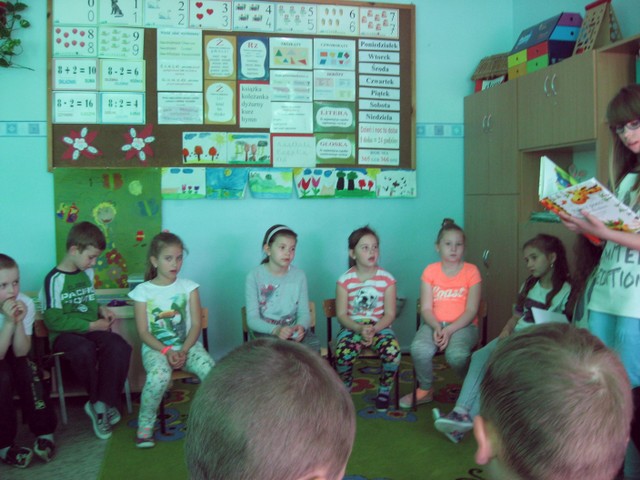 Uczestniczki projektu przedstawiły wiersze oraz biografię patrona naszej Szkoły Jana Brzechwy, grupie uczniów z klasy II b. Po przeczytaniu każdego z wierszy gimnazjalistki zadawały pytania dotyczące zaprezentowanego utworu. Uczniowie uważnie słuchali wierszy i z dużym zaangażowaniem udzielali odpowiedzi.