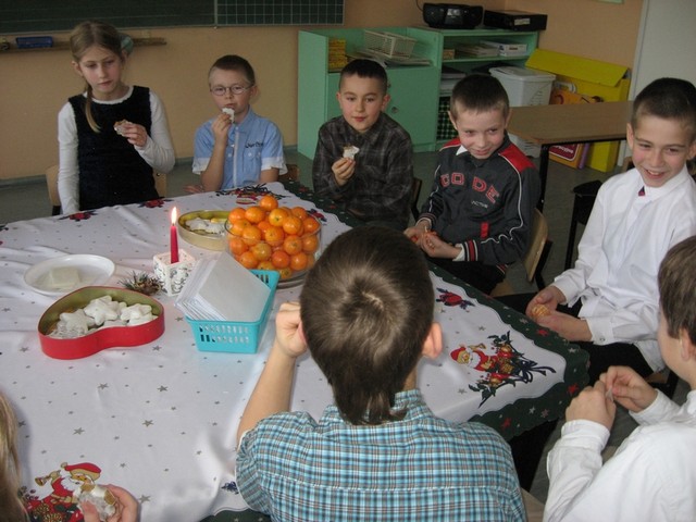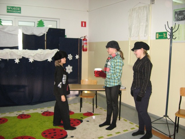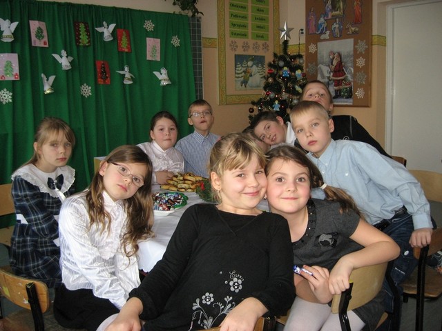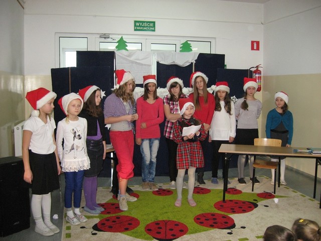 Ostatni dzień w szkole przed przerwą świąteczną, to jak co roku wspólne, klasowe wigilie oraz jasełka w wykonaniu naszych uczniów. Jasełka nawiązywały do "Opowieści wigilijnej" osadzonej w czasach współczesnych,co było bardziej zrozumiałe dla uczniów.W tym roku oprócz jasełek zostały zaprezentowane kolędy wykonane w języku angielskim. Śpiewały je dziewczęta z różnych klas, od klasy pierwsze do szóstej. Zarówno jasełka, jak i anglojęzyczne kolędy bardzo się podobały. Po obejrzeniu jasełek w klasach odbyły się spotkania opłatkowe.