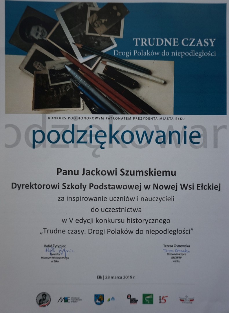 28 marca 2019 r. zostały ogłoszone wyniki V edycji konkursu historycznego „Trudne czasy. Drogi Polaków do Niepodległości”, którego organizatorem było Muzeum Historyczne w Ełku. Przedmiotem konkursu była autorska praca pisemna dotycząca Ełku i okolic w czasach II wojny światowej lub okresu powojennego.