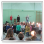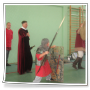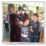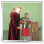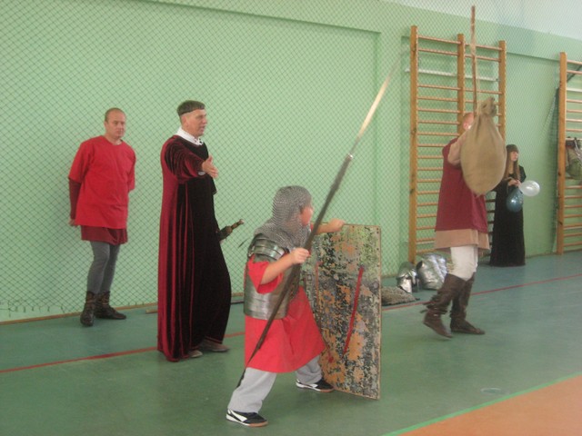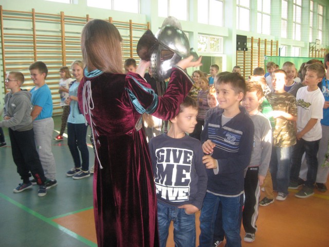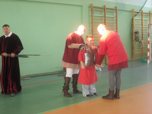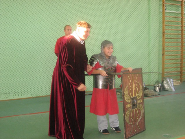 Autorzy przedstawienia nie pozwalali się nam nudzić. Po raz kolejny zaangażowali publiczność. Podczas prezentacji armii rzymskiej wybrani chłopcy zostali przebrani za żołnierzy. Szkolono ich umiejętności i ćwiczono ducha wojownika. Byliśmy też świadkami walki. Brzmi groźnie? Zapewne tak. Niestety, były to... balony zawieszone na kijku bądź ogromny worek. Ale na brak emocji nie można narzekać, żywiołowo walczący wojownicy dzielnie sprostali zadaniu.Na zakończenie pokazu wszyscy mieli możliwość przymierzenia hełmu wojownika oraz trzymania broni.