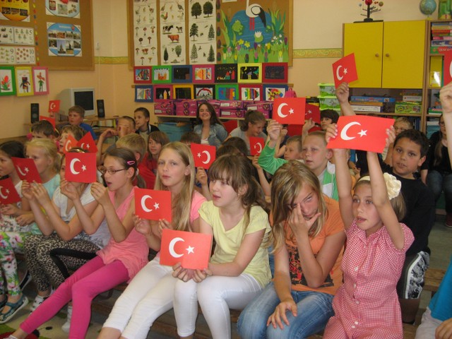 Uczniowie przywitali gościa słowami „salam alejkum” (co oznacza „pokój z tobą”) oraz tureckimi flagami.
