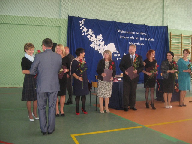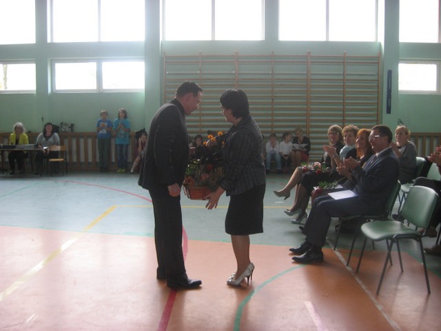 Uroczystym momentem było złożenie naszej p. Dyrektor, Bożenie Kulik, gratulacji i życzeń z okazji 30 lecia pracy pedagogicznej od wszystkich pracowników naszej szkoły. Przedstwaiciel Rady Rodziców naszej szkoły, p. Mariusz Gajek przekazał na ręce p. Dyrektor życzenia dla wszystkich pracowników. Była to bardzo miła niespodzianka. Po oficjalnej uroczystości odbył się poczęstunek, który przygotowali rodzice z poszczególnych klas.