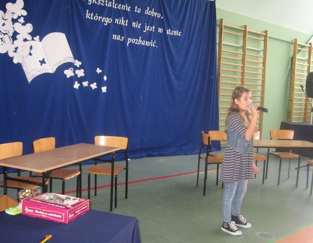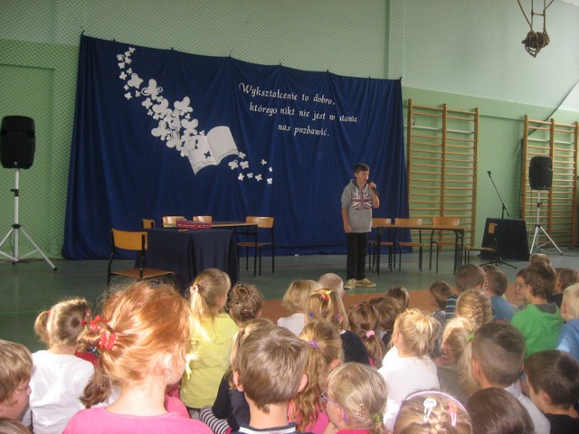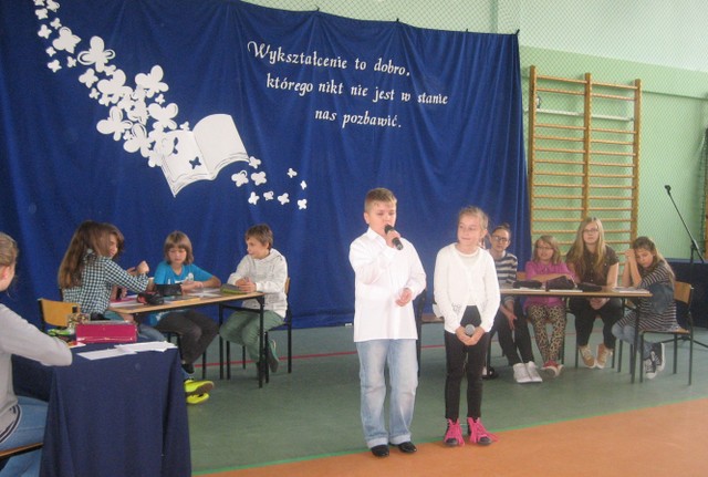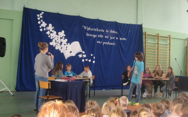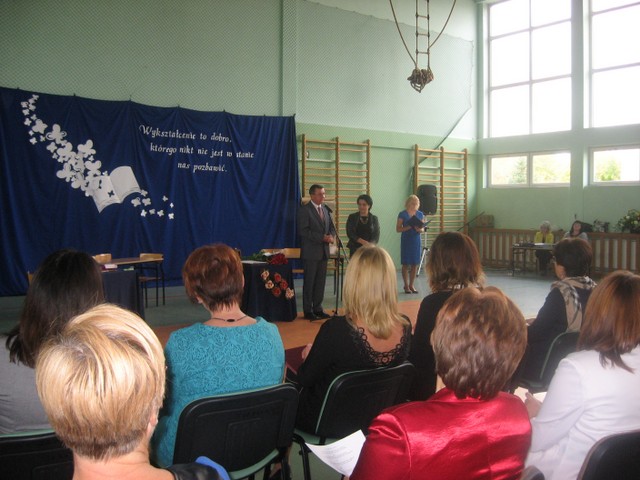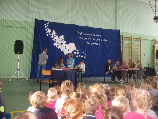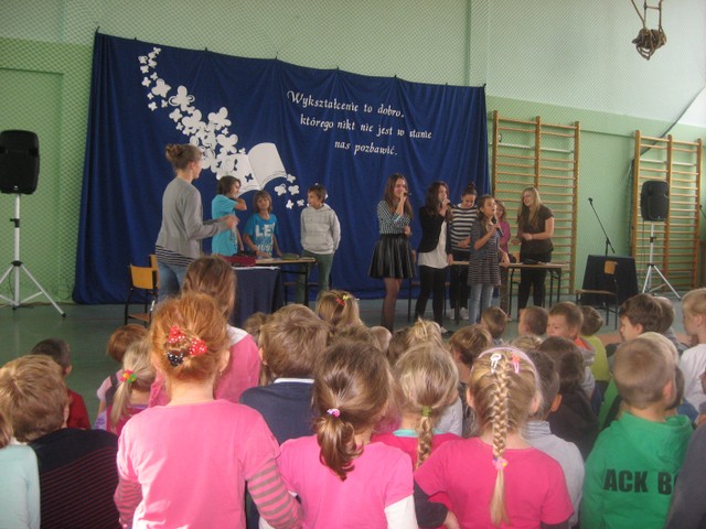 Obchody były szczególnie uroczyste, bo tym razem w naszej szkole odbywała się uroczystość gminna. Już z rana wszystkich uczniów i pracowników powitał piękny plakat z życzeniami wykonany przez Samorząd Uczniowski. Przewodnicząca SU Milena Worm wraz z przedstawicielami klas złożyła życzenia dla p. Dyrektor. Następnie odbył się apel, na którym uczniowie klas IV-VI zaprezentowali bardzo humorystyczny program związany ze szkołą i nauczycielami. Na zakończenie wszyscy wspólnie zaśpiewali piosenkę o naszej szkole.