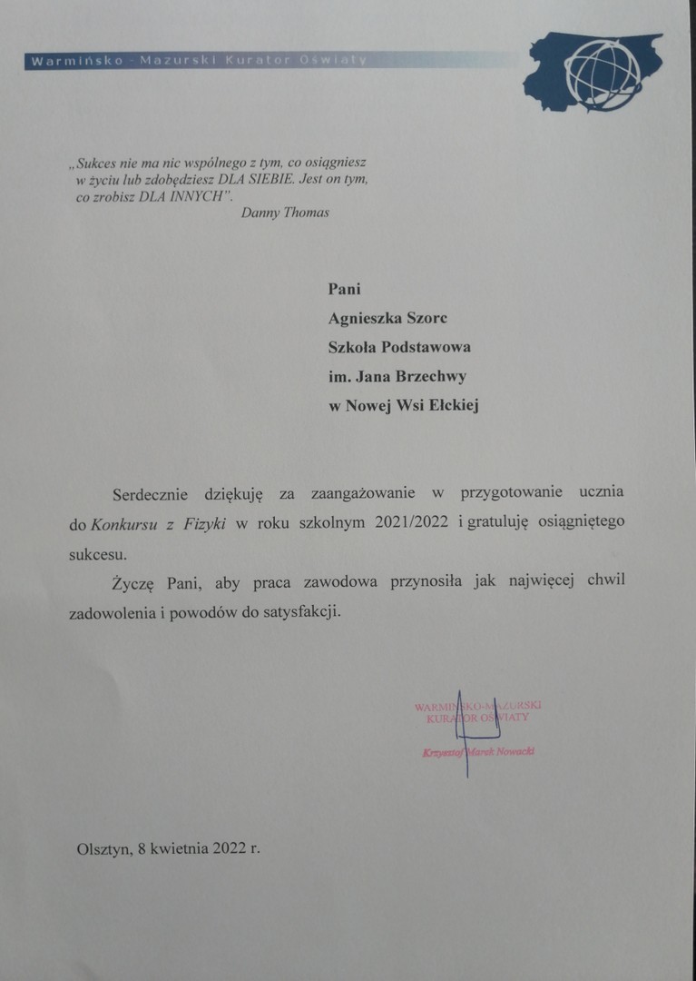 Paulina Choroś - laureatka Konkursu z Fizyki zorganizowanego przez Warmińsko-Mazurskiego Kuratora Oświaty