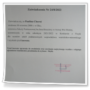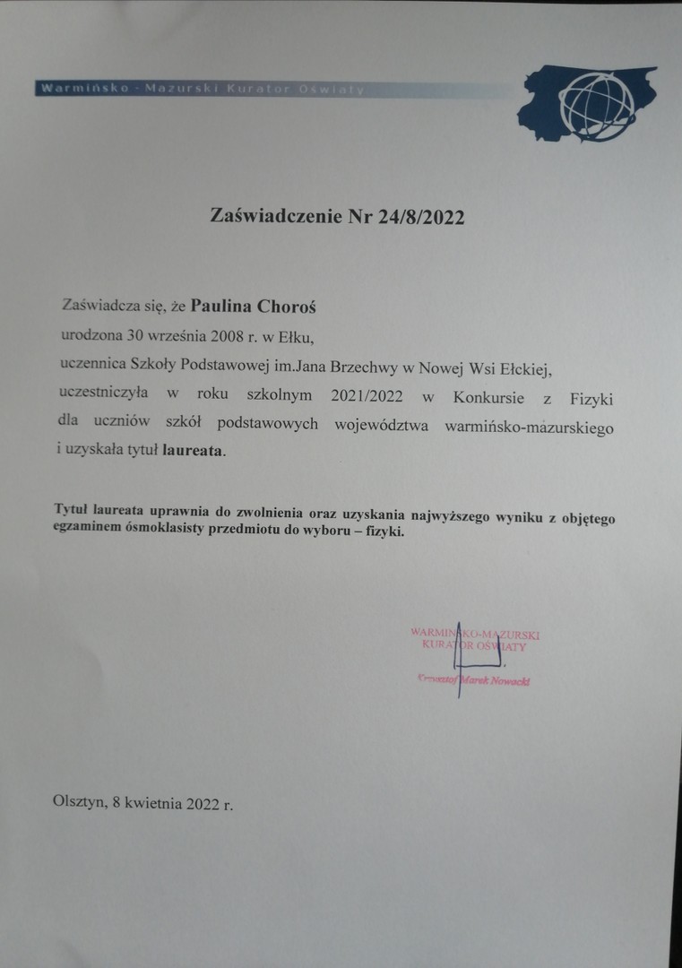 Paulina Choroś - laureatka Konkursu z Fizyki zorganizowanego przez Warmińsko-Mazurskiego Kuratora Oświaty-2021/2022