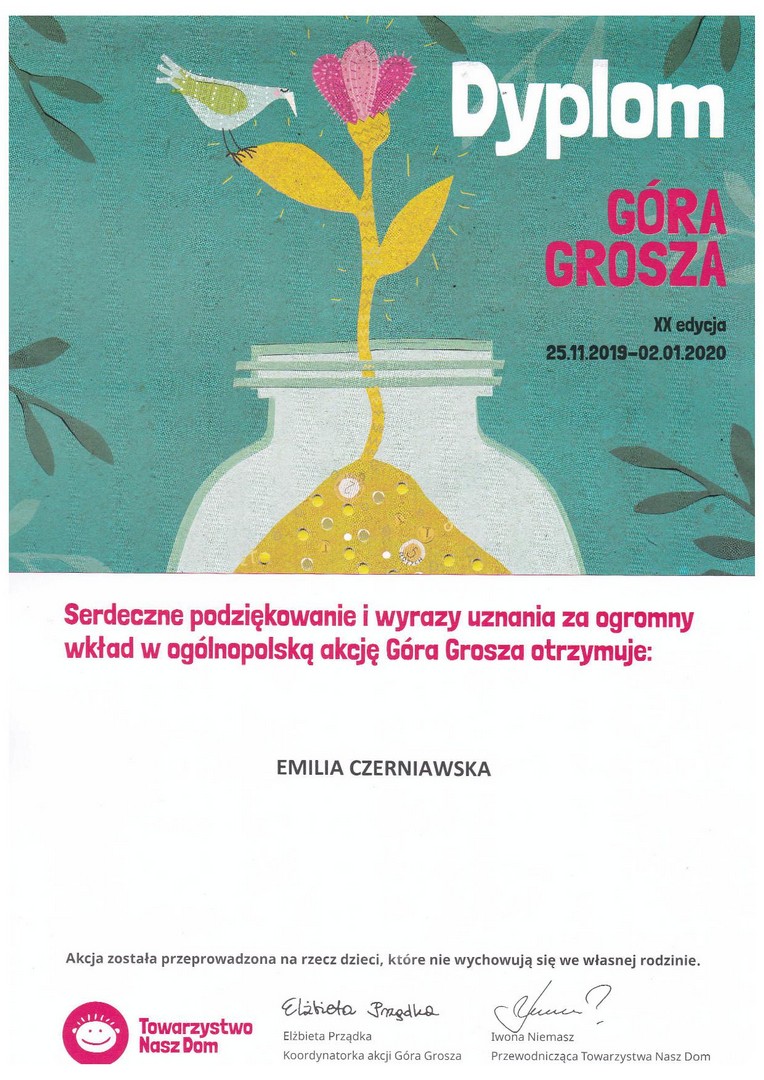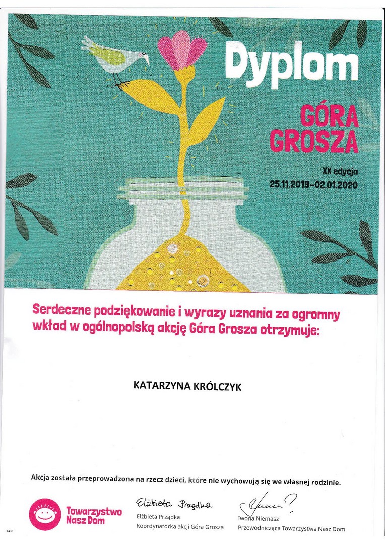 Jest to akcja o charakterze dobroczynnym, a jej głównym celem jest zebranie środków na pomoc dzieciom, które z różnych przyczyn nie mogą wychowywać się we własnym domu rodzinnym. Uczniowie oraz ich rodzice, nie pozostali obojętni na krzywdę drugiej osoby i chętnie się do tej akcji przyłączyli. W ten sposób wsparliśmy Towarzystwo Nasz Dom, a tym samym pomogliśmy dzieciom w całej Polsce, które nie mają możliwości i szczęścia dorastać wśród najbliższych. Towarzystwo Nasz Dom udziela bowiem wsparcia dzieciom z „zawodowych” rodzin zastępczych, rodzinnych domów dziecka, domów dla dzieci i innych placówek opiekuńczo wychowawczych. Ta wspaniała inicjatywa oprócz wspólnego celu została wyróżniona przez pana Dyrektora nagrodą. Po zakończeniu akcji przyszła pora na podliczenie wszystkich pieniędzy wrzuconych do skarbonki.