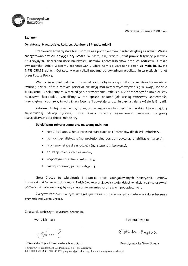 Podziękowanie od organizatorów akcji "GÓRA GROSZA"