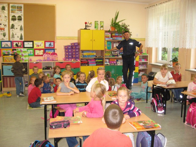 13 września 2013 r. uczniów klas 0 i I naszej szkoły odwiedził policjant z Wydziału Ruchu Drogowego Policji Powiatowej w Ełku.