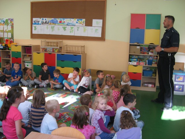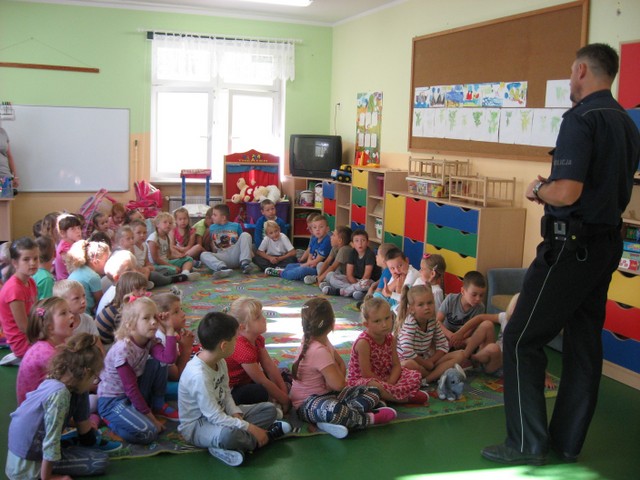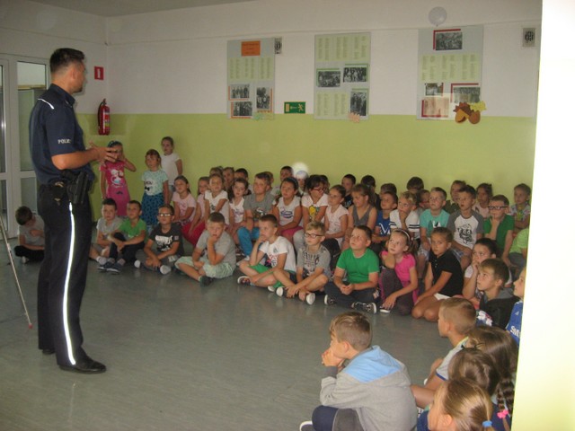 Uczestniczący w spotkaniu dzieci z uwagą i dużym zainteresowaniem wysłuchały pogadanki na temat bezpieczeństwa w drodze do oraz ze szkoły. Policjant poruszył także szczególnie ważny element bezpieczeństwa dla uczniów dojeżdzających, zachowanie bezpieczeństwa przy wsiadaniu oraz wysiadaniu z autobusu oraz zachowanie się podczas jazdy. Dla wielu dzieci wrzesień jest to czas pierwszego samodzielnego pokonania dystansu do i ze szkoły, dlatego ważna jest wiedza o ruchu drogowym.
