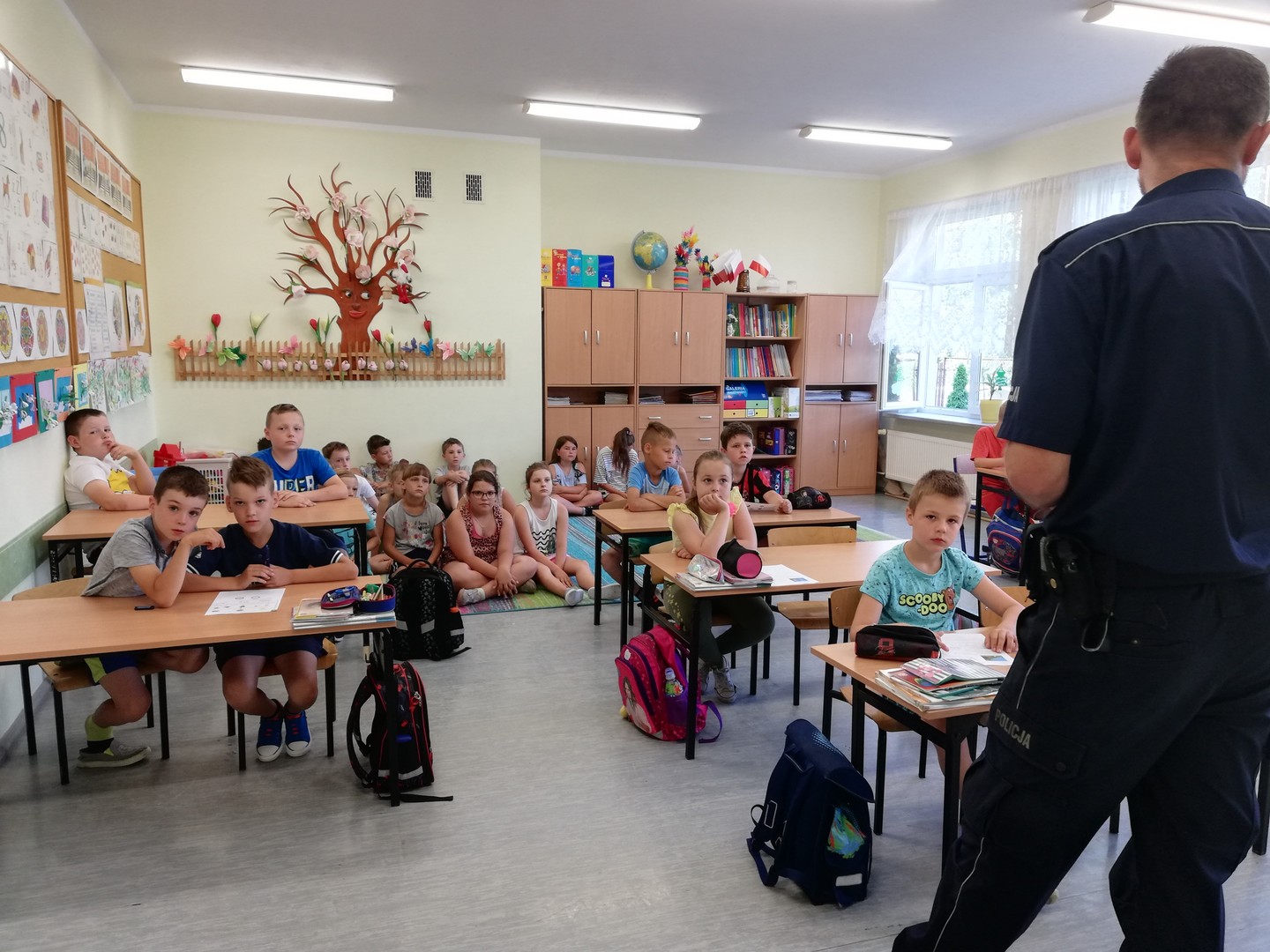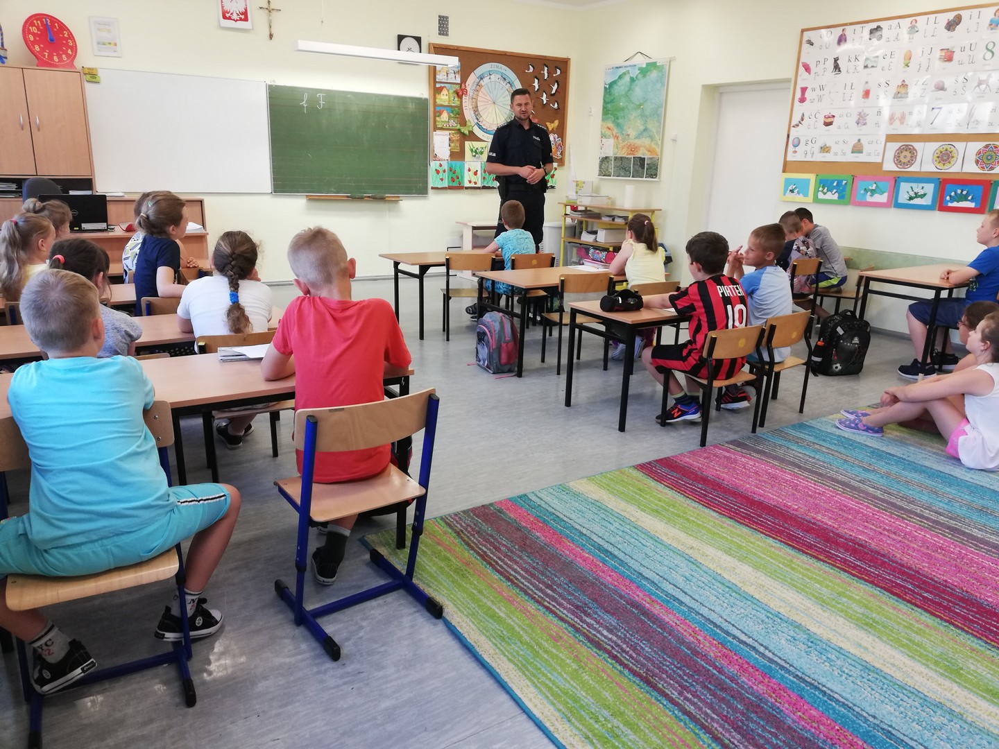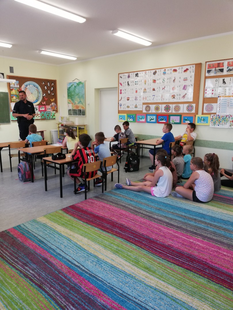 Zbliżają się wakacje i wszyscy udamy się na zasłużony wypoczynek. Żeby był on jeszcze bardziej radosny, musi być przede wszystkim bezpieczny. 13 czerwca 2019 r. uczniowie klas 0 - III uczestniczyli w spotkaniu z funkcjonariuszem z Komendy Powiatowej Policji w Ełku, asp. sztab. Arturem Milewskim. W trakcie spotkania uczniowie dowiedzieli się, jak bezpiecznie zachowywać się podczas nadchodzących wakacji oraz jak bezpiecznie poruszać się po drodze. Pan policjant zwrócił także uwagę na wzmożoną czujność w stosunku do osób nieznajomych, uważanie na to, czym nas ktoś częstuje. Przestrzegł też przed zabawami z obcymi zwierzętami.
