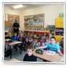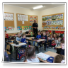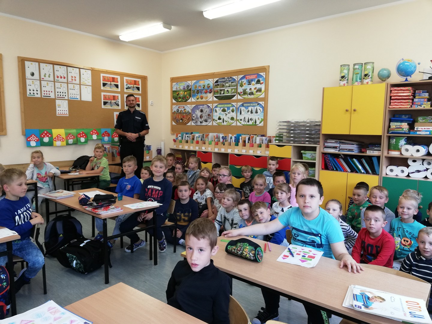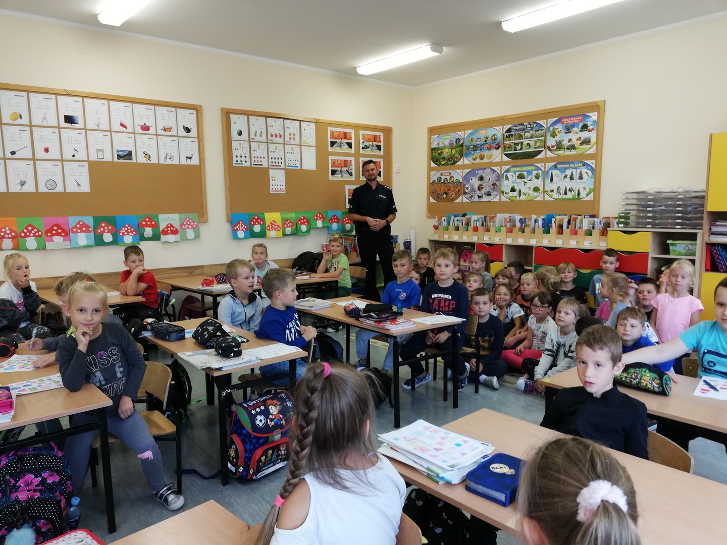 Uczestniczący w spotkaniu dzieci z uwagą i dużym zainteresowaniem wysłuchały pogadanki na temat bezpieczeństwa w drodze do oraz ze szkoły. Policjant poruszył także szczególnie ważny element bezpieczeństwa dla uczniów dojeżdzających, zachowanie bezpieczeństwa przy wsiadaniu oraz wysiadaniu z autobusu oraz zachowanie się podczas jazdy. Dla wielu dzieci wrzesień jest to czas pierwszego samodzielnego pokonania dystansu do i ze szkoły, dlatego ważna jest wiedza o ruchu drogowym.