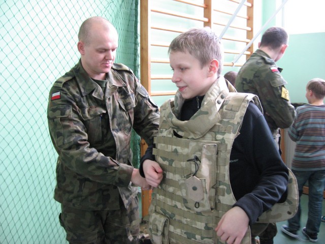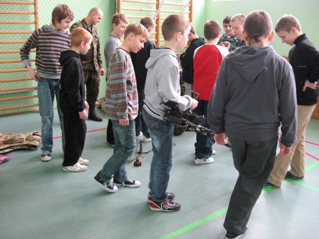 Takie przedmioty można spotkać jeszcze do dziasiaj. Pogadanka przybliżyła naszym uczniom zadania jakie wypełniają żołnierze w czasie pokoju. Zołnierze opowiadali o działalności patroli rozminowania: o podziale na rejony odpowiedzialności, składzie patroli oraz wyposażeniu.