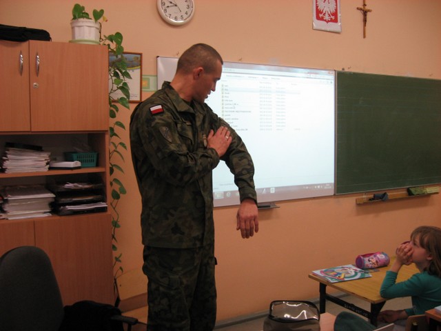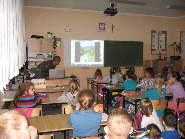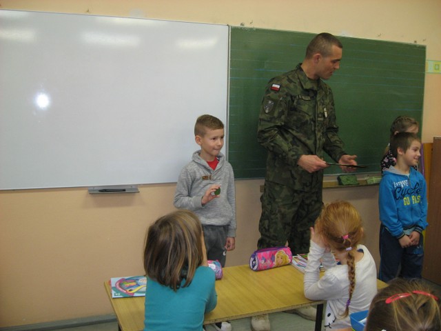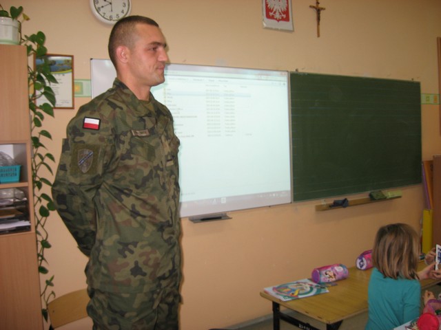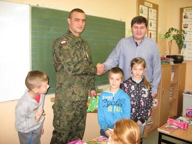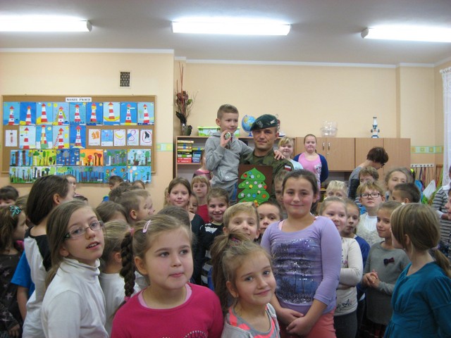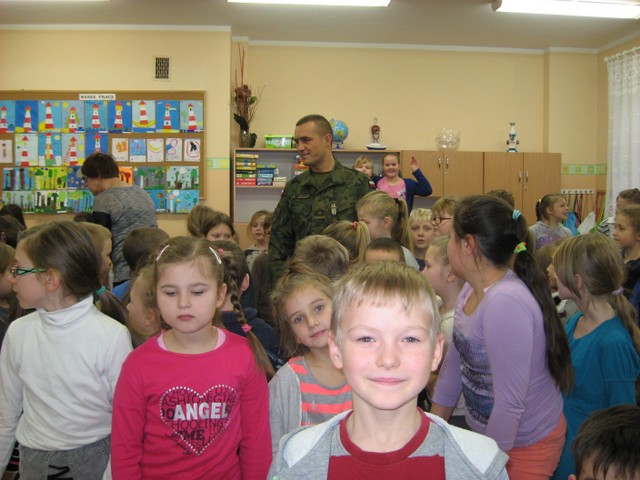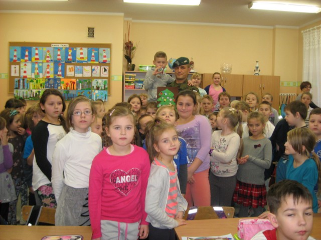 9 grudnia 2015 r. klasy drugie i trzecie spotkały się z żołnierzem misji pokojowej ONZ w Awganstanie i Kosowie, starszym szeregowym Arturem Uściłowiczem. Nasz gość opowiedział dzieciom na czym polegają misje pokojowe wojsk Organizacji Narodów Zjednoczonych. Opowiadał o życie żołnierzy w bazach wojskowych, pokazywał zdjęcia i filmy. Dzieci miały możliwość zobaczyć mieszkańców tych krajów i krajobraz, który bardzo różni się od naszego. Pan Uściłowicz pokazywał dzieciom swoje odznaczenia a także opowiadał o elementach munduru. Dzieci zobaczyły, jak trudne i niebezpieczne są wyjazdy żołnierzy na misje.Na zakończenie spotkania p. dyrektor Jacek Szumski oraz przedstawiciele uczniów podziękowali naszemu gościowi za ciekawe opowieści. Dzieci wykonały i własnoręcznie podpisały laurkę, a p. Artur przekazał klasie II a medal z Kosawa o nazwie KFOR.