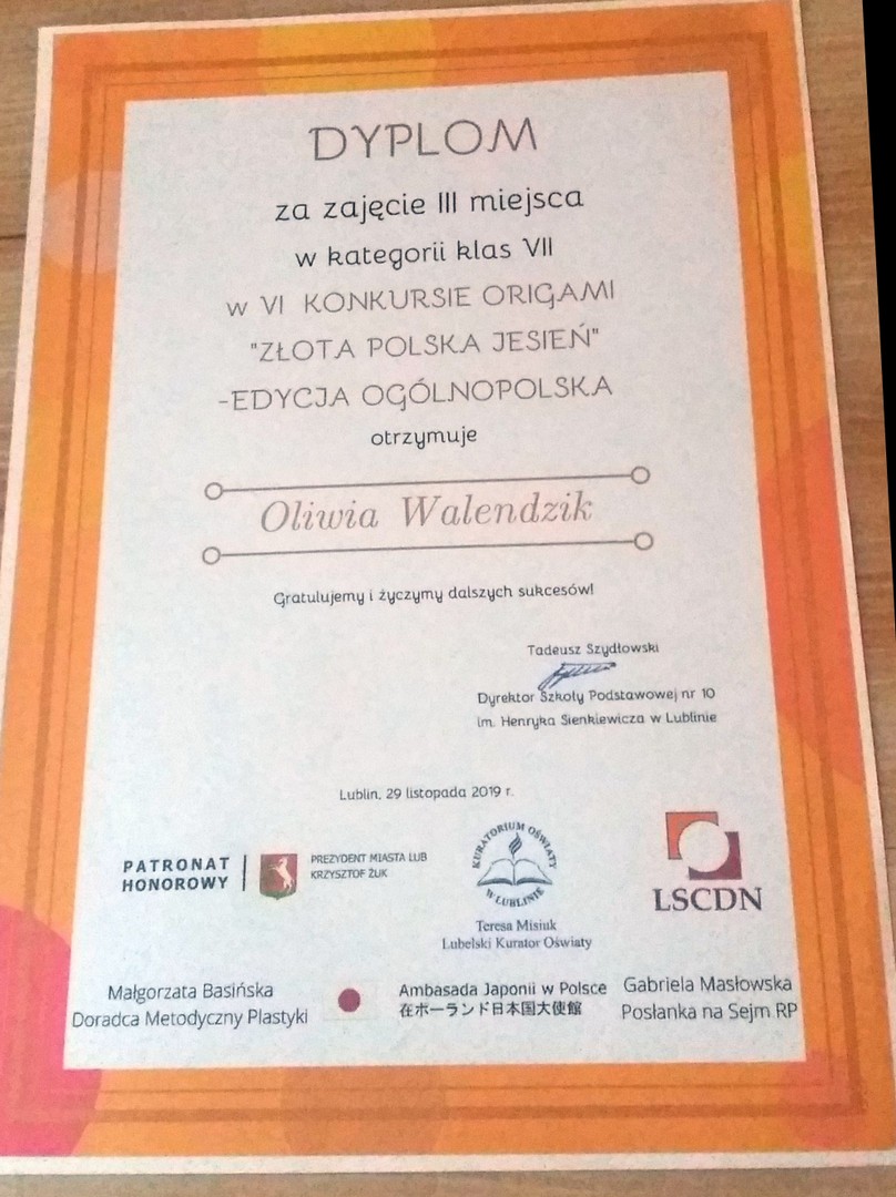 Z przyjemnością informujemy, że uczennica klasy VII b Oliwia Walendzik została laureatką VI Międzyszkolnego Konkursu Origami ,,Złota polska jesień” – Edycja ogólnopolska