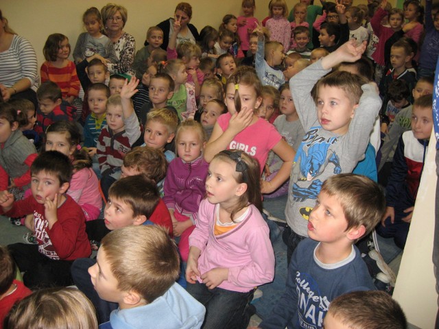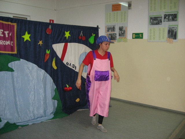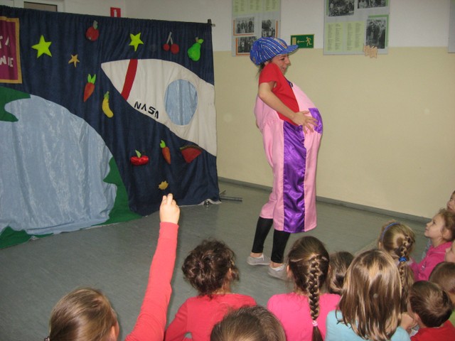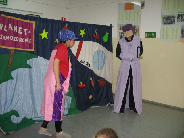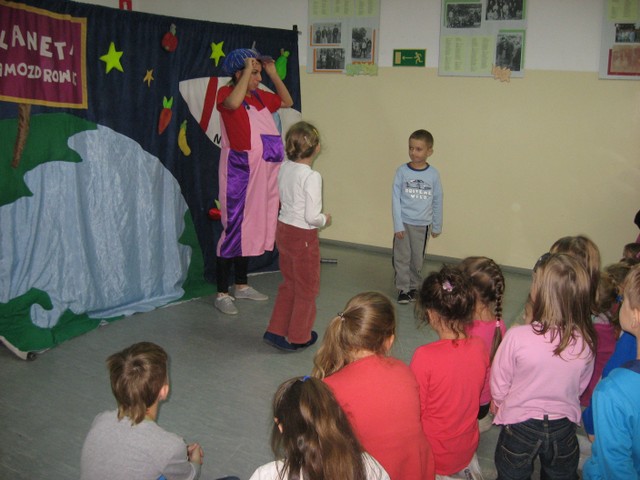 14 listopada 2013 r. uczniowie nasze szkoły mieli przyjemność obejrzenia przedstawienia pt.: „Planeta Samozdrowie i misja generała Osiłka” w wykonaniu aktorów ze studia artystycznego AKADA. Bajka opowiadała o prawidłowych sposobach odżywiania się. Główni bohaterowie przedstawienia pokazali dzieciom, jakie skutki niesie ze sobą spożywanie dużej ilości słodyczy i zbyt długie siedzenie przed telewizorem. Aktywne włączenie się uczniów do spektaklu pozwoliło na sprawdzenie posiadanych wiadomości na temat sposobów dbania o własne zdrowie poprzez jedzenie warzyw, owoców, picie wody i uprawianie sportu. W trakcie przedstawienia dzieci miały możliwość pochwalenia się własną tężyzną fizyczną, spostrzegawczością i umiejętnościami edukacyjnym podczas nauki jednego z bohaterów różnych ćwiczeń.