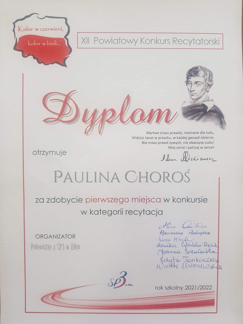 XII Powiatowy Konkurs Recytatorski "Kolor w czerwieni, kolor w bieli..."2021/2022