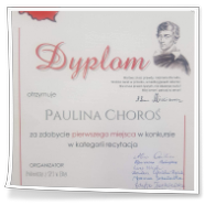Uczennica naszej szkoły- Paulina Choroś zajęła I miejsce w kategorii recytacja klas 7-8.